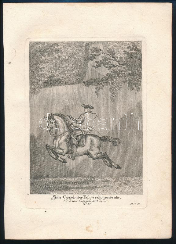 Description: XVIII. század közepe Johann Elias Ridinger (1698-1767): Halbe Capriole oder Passo é salto gerade aus. La demie Capriole tout droit. No. 41. Rézmetszet, papír, jelzett a dúcon, lovas metszet, kis foltokkal, 20x14 cm, papír: 28x20 cm