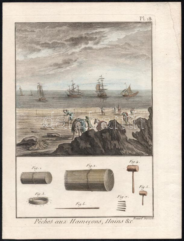XVIII. század vége, Robert Bénard (1734 -1785): Peches aux Hamecons, Hains & c., halászati témájú ábrázolás, In: Diderot - D'Alambert: Encyclopédie Pl. 18., színezett rézmetszet, papír, paszpartuban, foltos, 23x16 cm, papír: 28x21 cm