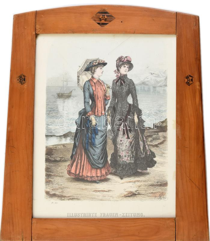 Description: cca 1880 Női divatok, Illustrirte Frauen-Zeitungból, színezett rotációs fametszet, papír. Jelzett a metszeten. Lapszéli néhány apró folttal. Dekoratív, üvegezett keretben, 31×25 cm