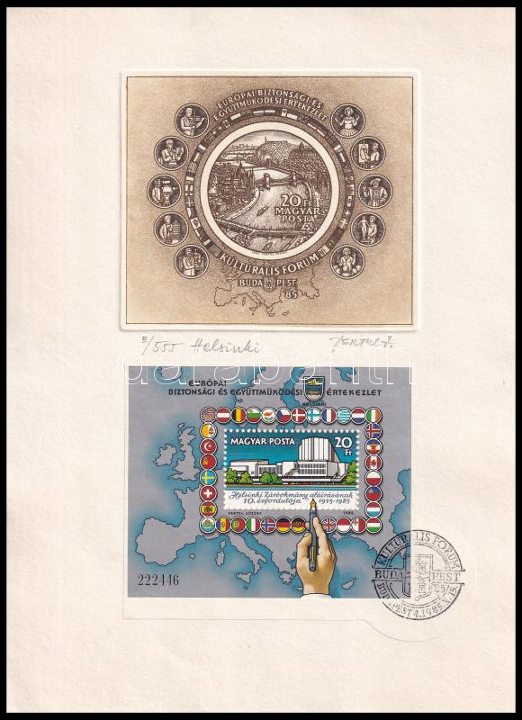 Vertel József (1922-1993): Helsinki EBESZ. Rézkarc, papír, jelzett, sorszámozott B/555 rajta a tervezett blokkal. 8x9,5 cm