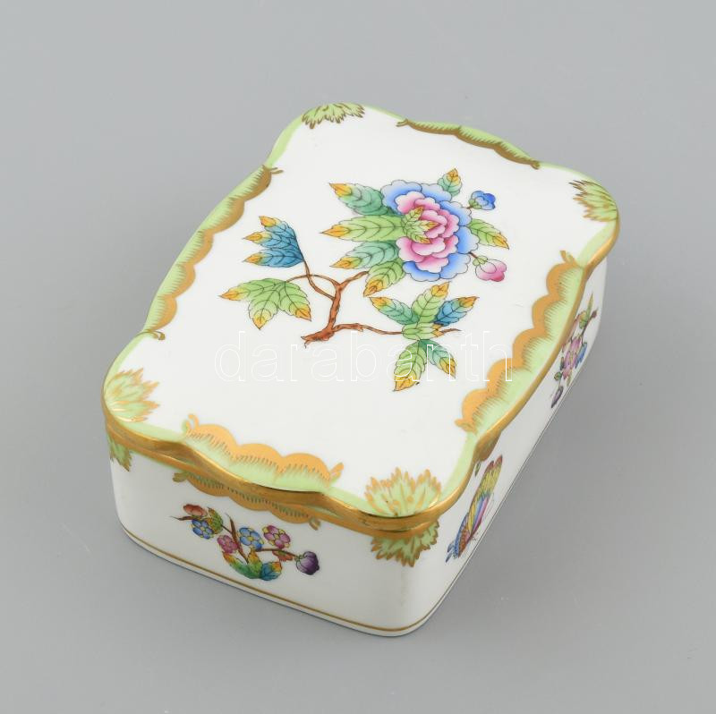 https://www.darabanth.com/en/437-Online-auction/437.0/Porcelain-ceramics-glassware/Chinaware-Porcelain~500006/Herendi-Viktoria-mintas-porcelan-bonbonniere-Kezzel-festett-jelzett-hibatlan-14x10-cm~II2838073
