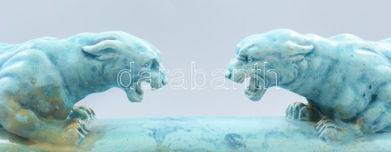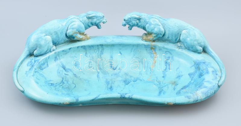 Zsolnay labrador alapmázas oroszlános asztali figurális dísztál, jelzett, formába nyomott Zsolnay pecsét és 8094-es formaszám, régi ragasztás, restaurálás nyomaival, kis lepattanással. 48 cm