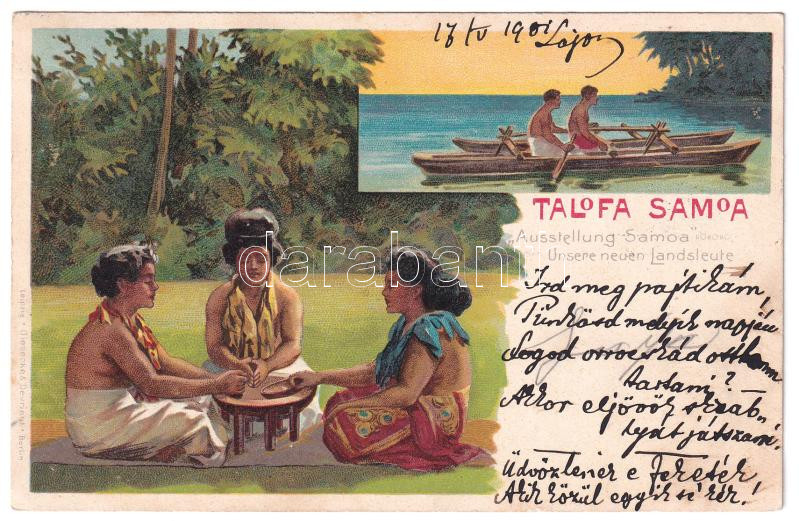 1901 Talofa Samoa. Ausstellung Samoa Unsere neuen Landsleute. Giesecke & Devrient / German colonial exhibition advertisement, litho (EK)