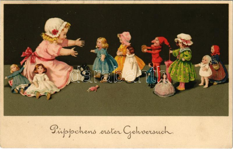 1914 Püppchens erster Gehversuch / Kislány babákkal / Girl with dolls. Meissner & Buch Künstler-Postkarten Serie 2000. Puppenmütterchen litho (EK)