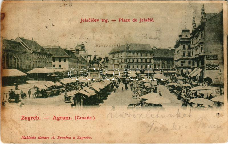 1901 Zagreb, Zágráb; Jelacicev trg / square, market, shops, tram (EM)
