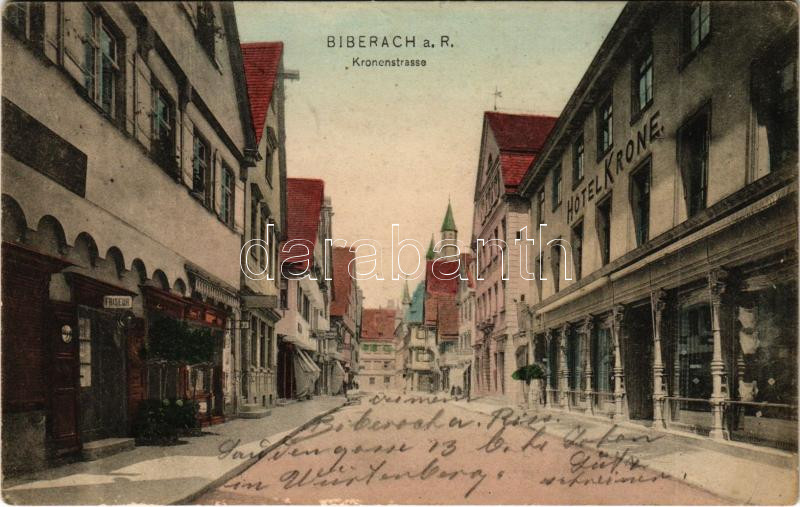 1907 Biberach an der Riß, Kronenstrasse, Hotel Krone, Friseur / street, hotel, hairdresser (EK)