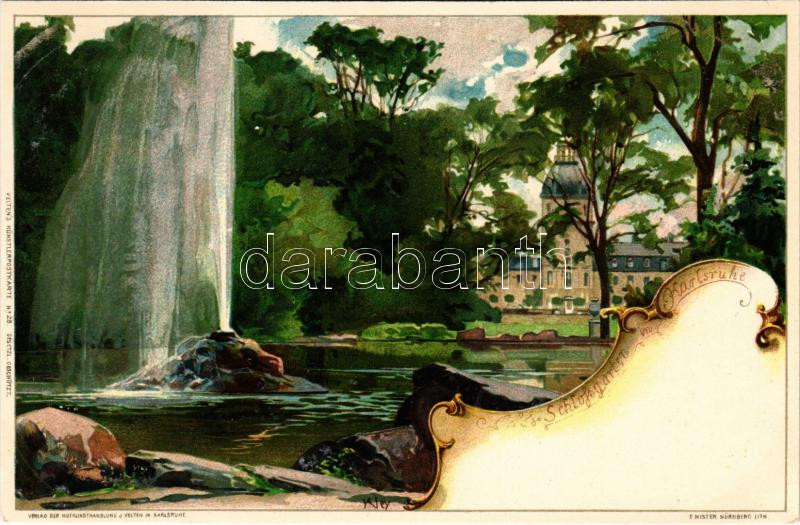 Karlsruhe, Schlossgarten / castle garden. Velten's Künstlerpostkarte No. 28. Art Nouveau, litho s: Kley
