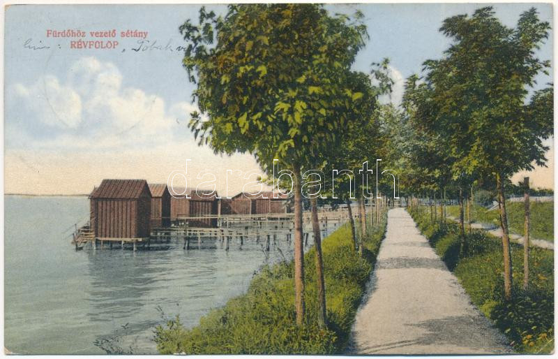 1915 Révfülöp. Fürdőhöz vezető sétány, kabinok a Balaton partján. Csényi Istvánné kiadása (EK)