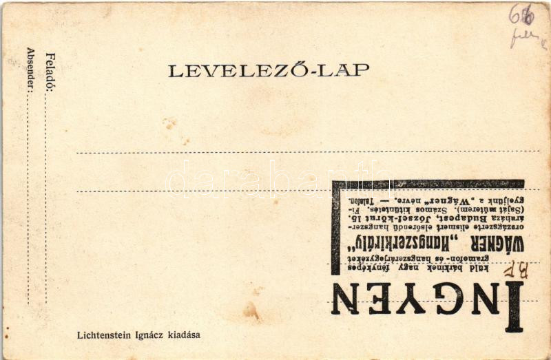 Kunmadaras, takarékpénztár, Kohn Károly fia üzlete. LIchtenstein Ignác kiadása, hátoldalon Wagner Hangszerkirály reklám
