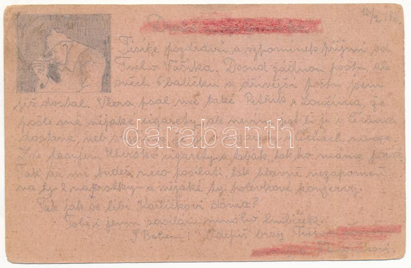 Description: 1916 K.u.k. Infanterie Regiment 88. 2. Feldkompagnie Feldpostkorrespondenzkarte / Cs. és kir. 88. gyalogezred tábori posta levelezőlap - saját kézzel rajzolt katona / WWI Austro-Hungarian military hand-drawn field post (kis szakadás / small tear)
