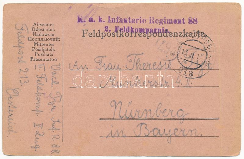 1916 K.u.k. Infanterie Regiment 88. 2. Feldkompagnie Feldpostkorrespon... https://www.darabanth.com/en/437-Online-auction/437.0/Postcards/Militaria~1500058/1916-Kuk-Infanterie-Regiment-88-2-Feldkompagnie-Feldpostkorrespondenzkarte-Cs-es-kir-88-g~II2841686