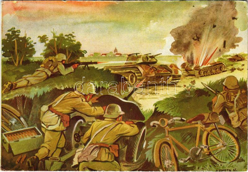 Pardi József tizedes, páncéltörő-ágyús parancsnok, kerékpárosok / WWII Hungarian military, tank, '1943 Haditudósító Kiállítás a Pesti Vigadóban' So. Stpl s: Németh (EK)