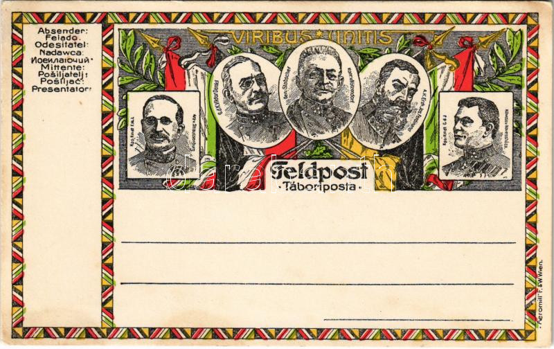 Description: Viribus Unitis Tábori Posta: Arz. v. Straussenburg, Konr. v. Hötzendorf, Viktor Dankl, Erzh. Jos. Ferdinand, Kövess v. Kövessháza - Első világháborús katonai lap / Feldpost