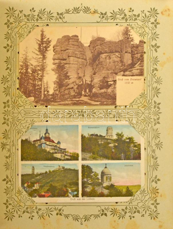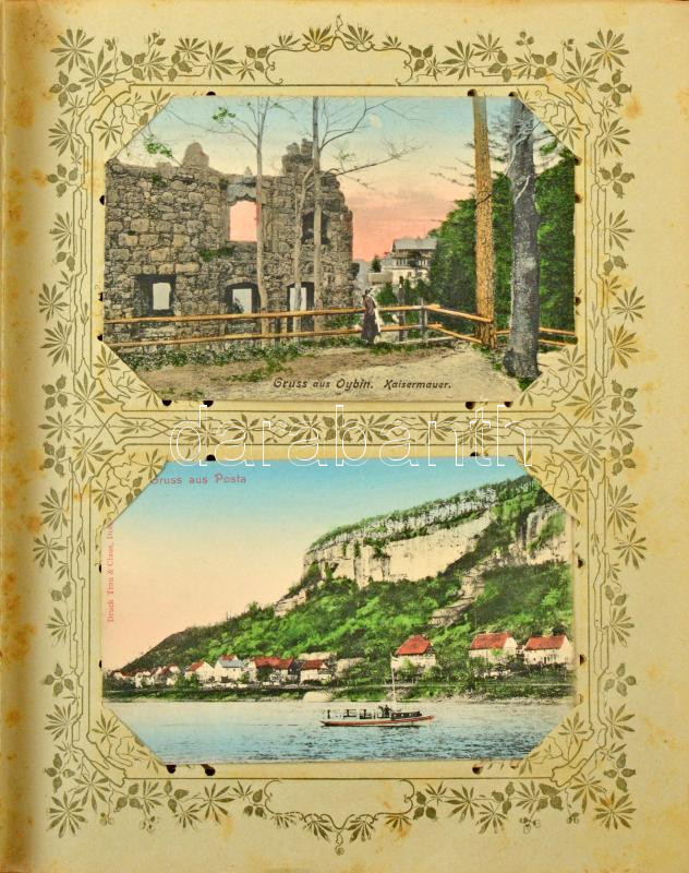 Description: 100 db RÉGI "Gruss aus" képeslap szecessziós albumban, lithokkal, külföldi városok és motívumok, sok századforduló előtti / 100 pre-1945 "Gruss aus" postcards in an Art Nouveau album: many European town-views and motives, lithos, many pre-1900