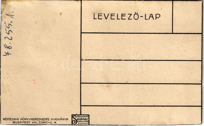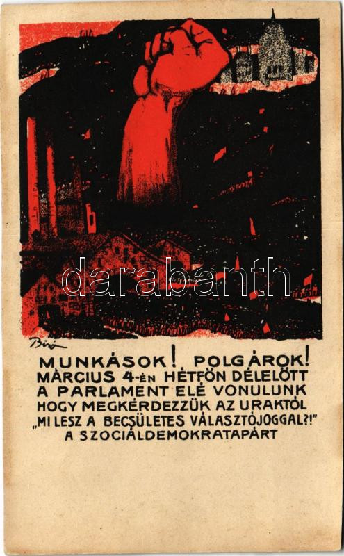 Munkások! Polgárok! Március 4-én hétfőn délelőtt a Parlament elé vonulunk, hogy megkérdezzük az uraktól: Mi lesz a becsületes választójoggal? A Szociáldemokrata Párt felhívása Parlament elé vonulásra és tömegsztrájkra. Népszava könyvkereskedés kiadványa, Seidner chromolithografia / Hungarian Social Democrat Party propaganda postcard s: Biró (r)