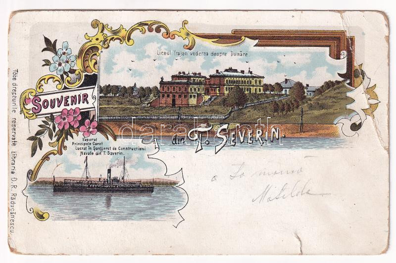 Description: 1902 Turnu Severin, Szörényvár; Liceul Trajan vederea despre Dunare, Vaporul Principele Carol Lucrat in Santierul de Constructini Navale / school, steamship. D.R. Raducanescu Art Nouveau, floral, litho (tear)