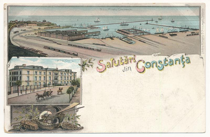Constanta, Noul Portu Constanta, Hotel Carol / new port, railway station, train, hotel. Art Nouveau, floral, litho (glue marks)