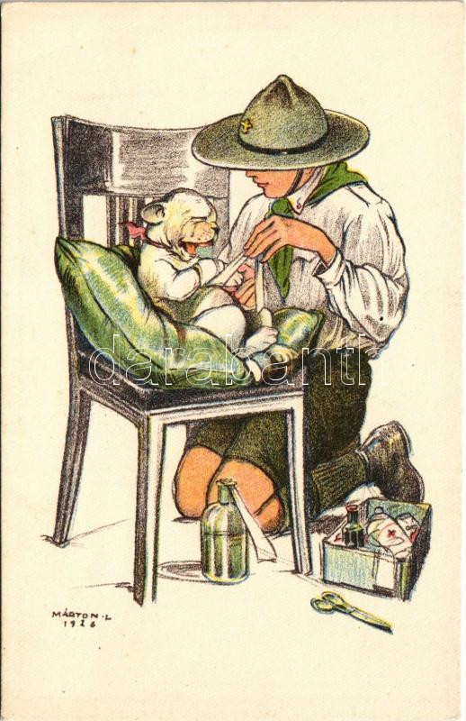 A cserkész, ahol tud, segít. Kiadja a Magyar Cserkészszövetség Nagytábortanácsa 1926 / Hungarian boy scout art postcarrd s: Márton L. (EK)