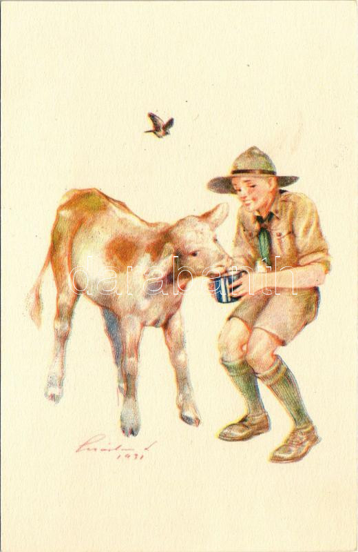 A cserkész szereti a természetet, jó az állatokhoz. A Magyar Cserkészszövetség kiadása / Hungarian boy scout art postcard s: Márton L.