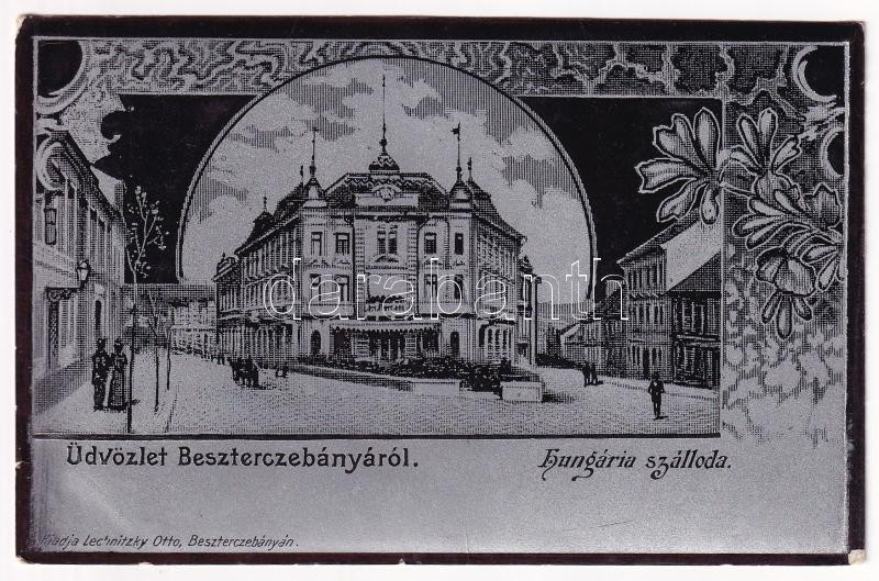 Besztercebánya, Banská Bystrica; Hungária szálloda. Lechnitzky Otto kiadása. Szecessziós fémes hatású fóliás képeslap / hotel. Art Nouveau, floral, metallic foil postcard (EK)