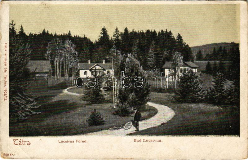 Lucsivna, Lautschburg, Lucivná (Magas-Tátra, Vysoké Tatry); kerékpár, nyaralók. Feitzinger Ede 339. Kr. 1902/12 / bicycle, villas (EK)
