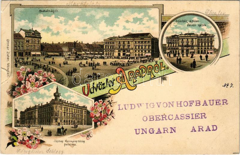1897 (Vorläufer) Arad, Szabadság tér, színház épület délről nézve, József (Jószag) Kormányzóság palotája / square, theatre, Governing palace. Ottmar Zieher Art Nouveau, floral, litho (EK)