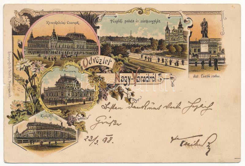 1898 (Vorläufer) Nagyvárad, Oradea; Kereskedelmi Csarnok, múzeum, Kishídfő, Püspöki palota és székesegyház, Szt. László szobor. Sonnenfeld Adolf kiadása / museum, bridge, bishop's palace, cathedral statue, Trading hall. Art Nouveau, floral, litho (kis szakadás / small tear)