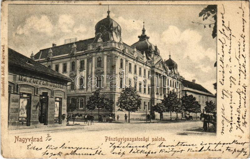 1900 Nagyvárad, Oradea; Pénzügyigazgatósági palota, Ifj. Popper József üzlete. Sonnenfeld Adolf kiadása / financial palace, shop (EB)