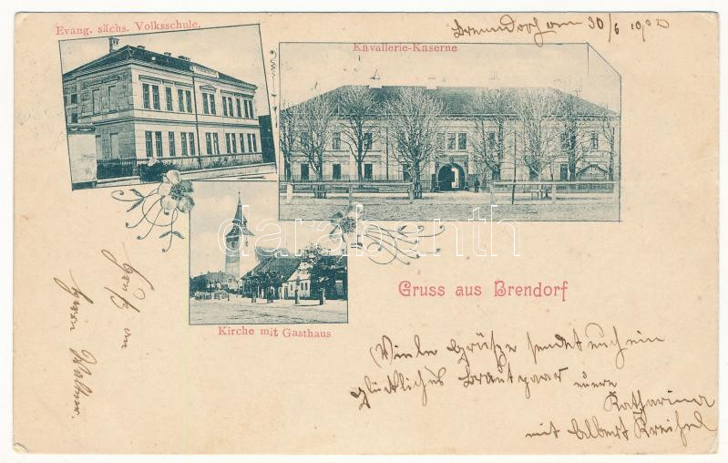 1902 Botfalu, Brendorf, Brenndorf, Bod (Brassó, Kronstadt, Brasov); Evang. sächs. Volksschule, Kavallerie-Kaserne, Kirche mit Gasthaus / szász evangélikus népiskola, lovassági laktanya, templom, vendéglő / Lutheran school, K.u.K. military cavalry barracks, church, inn. Art Nouveau, floral (fa)