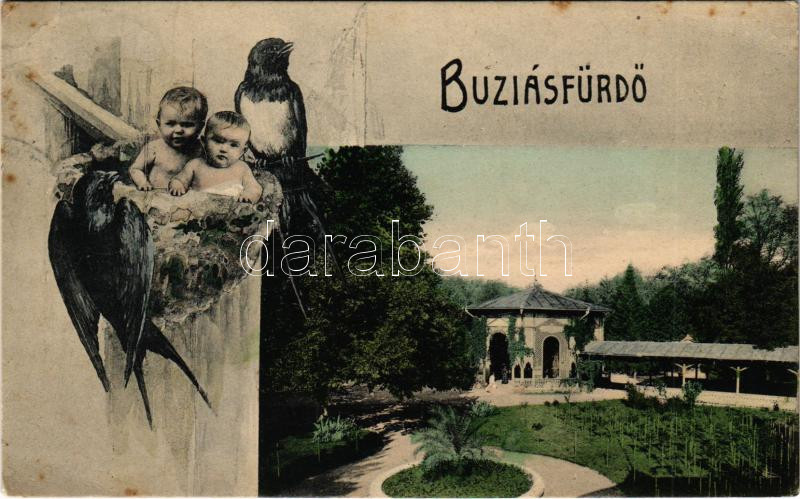 Description: 1913 Buziásfürdő, Baile Buzias; forrás. Szecessziós montázs fecskékkel és kisbabákkal. Francz József kiadása / spring. Art Nouveau montage with swallows and babies (EK)