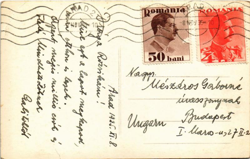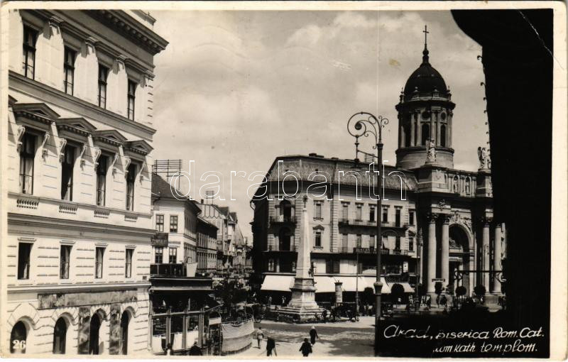 1935 Arad, Római katolikus templom, tér, szobor, Bere étterem, vendéglő, szobor, Dacia Romania, City Drogueria / church, square, shops, restaurant, monument. photo (EK)