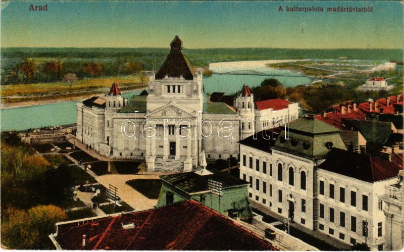 Arad, A Kultúrpalota madártávlatból. Vasúti levelezőlapárusítás 49. sz...
