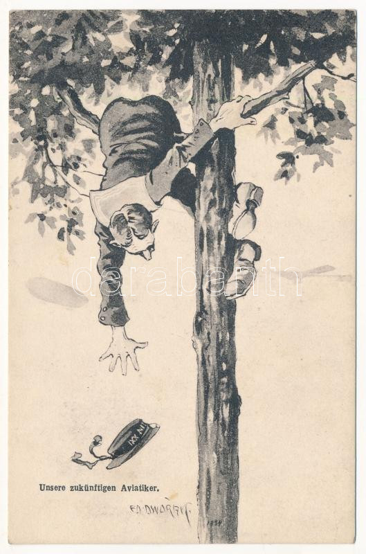 1916 Unsere zukünftigen Aviatiker. K.u.K. Kriegsmarine Matrose / WWI Austro-Hungarian Navy mariner humour art postcard. C. Fano 5858. 1912/13. Pola s: Ed. Dworak + "K.u.K. Marinespitalskommando Pola" (fl)