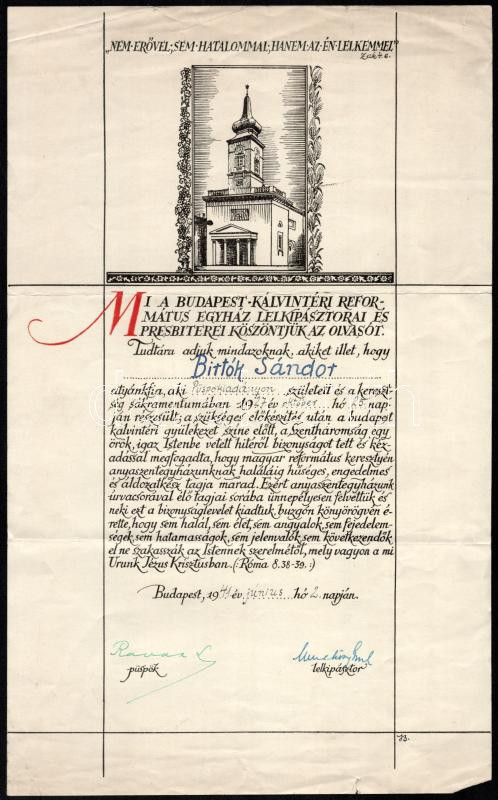 1941 Ravasz László református püspök aláírása Kálvin téri templom okle...