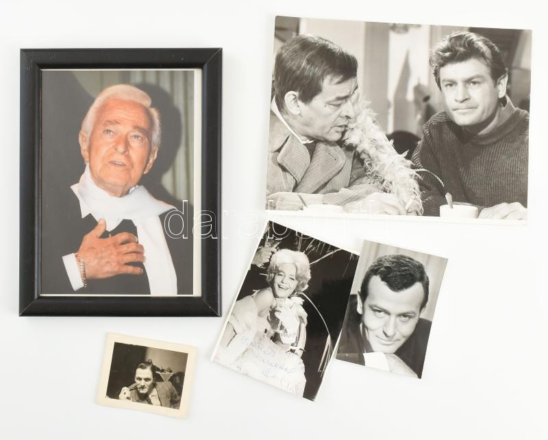 Description: Temessy Hédi (1925-2001), Somogyvári Rudolf (1916-1976) és Pataky Jenő (1914-1996) magyar színművészek dedikált fotói + Stanisław Mikulski (1929-2014) lengyel színész Sivó Emil részére dedikált fotója + Sivó Emil színházi rendezőt ábrázoló fotó