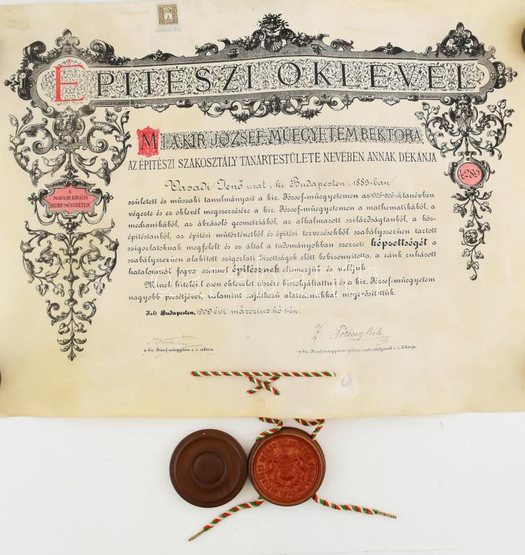 1909 Építészmérnöki pergamen diploma függőpecséttel Műegyetem