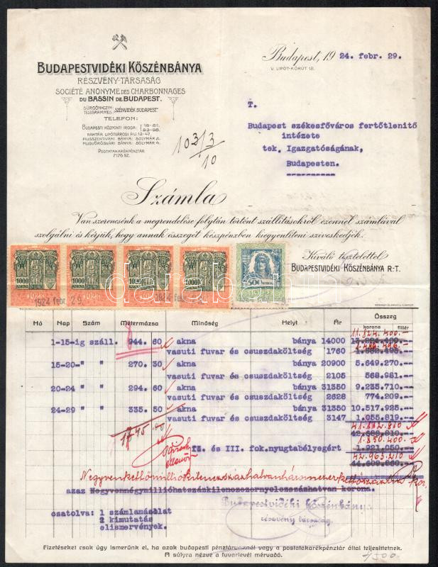 1924 Budapestvidéki Kőszénbánya, fejléces számla, 4x1000 é 500 korona ...