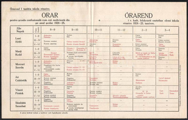 1925 Gyulafehérvár, iskolai órarend magyar és román nyelven
