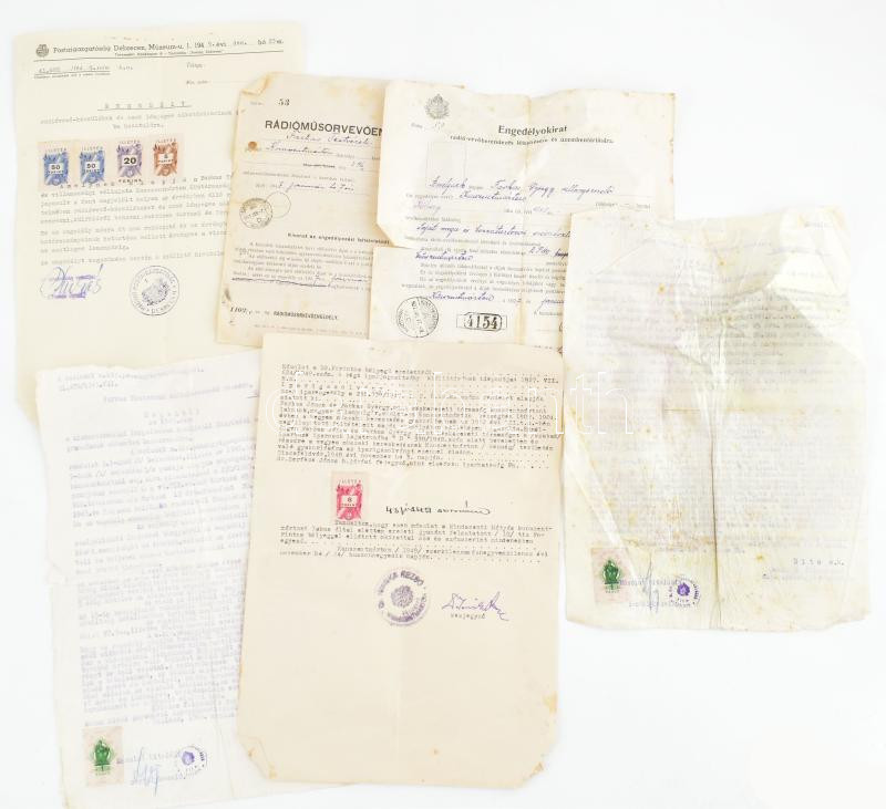Description: 1927-1949 A kunszentmártoni Farkas Testvérek műszaki és villamossági vállalatának iratai: rádió üzemeltetési és forgalmazási engedélyek, hiteles másolatok, össz. 6 db, vegyes állapotban