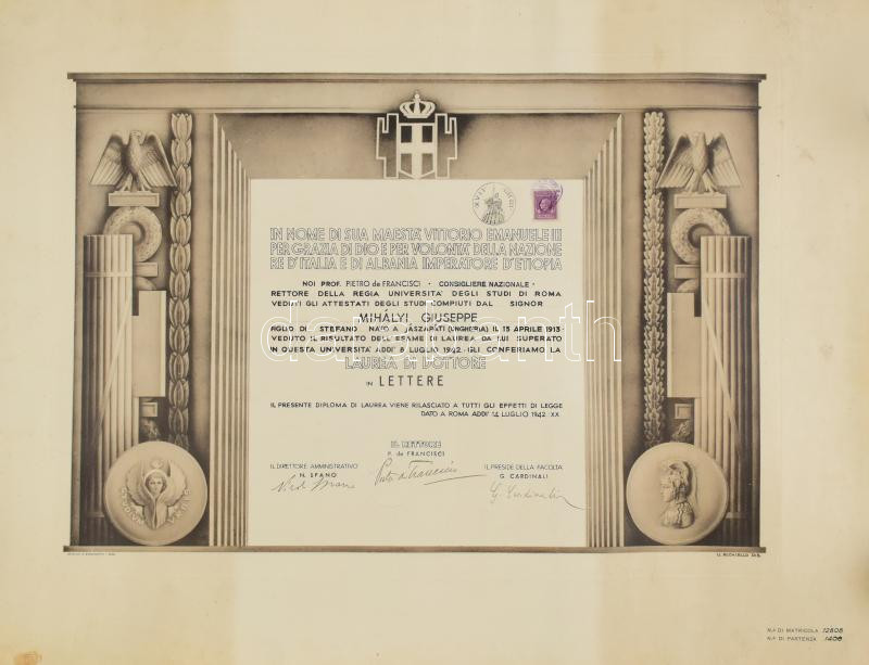 1936-1942. "Középiskolai Tanári Oklevél. A Debreceni M. Kir. Középiskolai Tanárvizsgáló Bizottság" + olasz diploma, bélyegekkel.