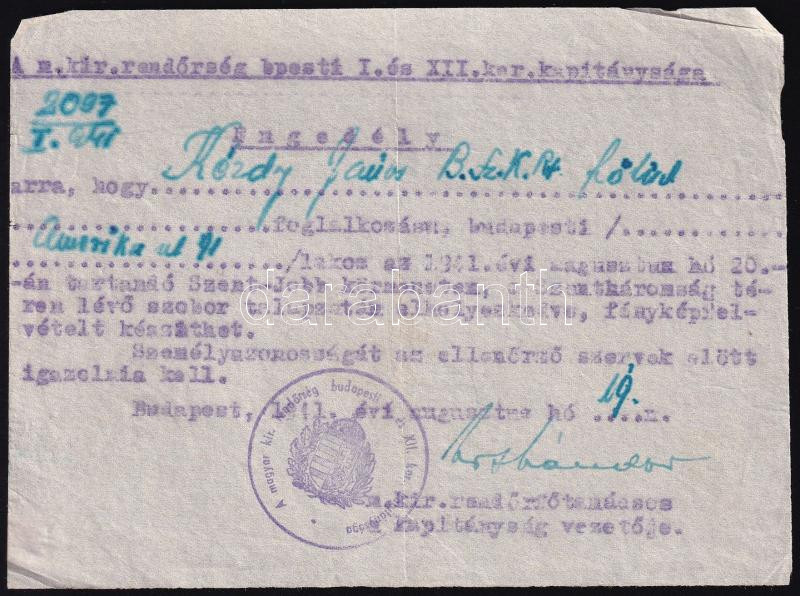 1941 Bp., a m. kir. rendőrség budapesti I. és XII. ker. kapitánysága á... https://www.darabanth.com/en/438-Online-auction/438.0/Art-and-other-collectibles/Documents~500020/1941-Bp-a-m-kir-rendorseg-budapesti-I-es-XII-ker-kapitanysaga-altal-kiallitott-engedC3~II2859570
