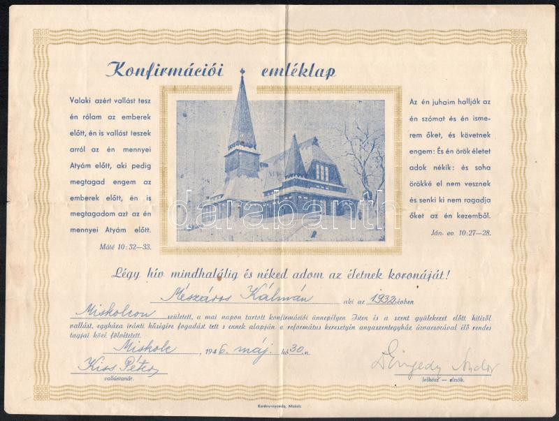 1946 Konfirmációi emléklap a miskolci deszkatemplom képével díszítve, ...