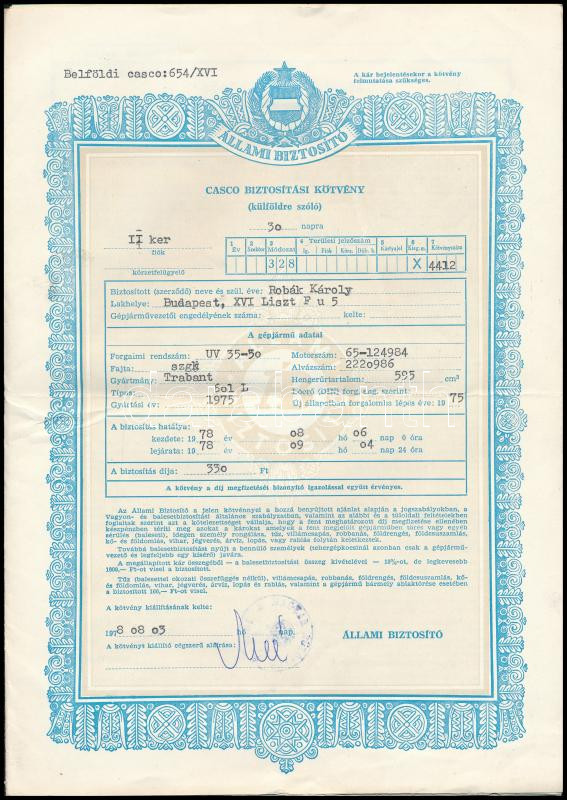 1978 Trabant 601 L gépkocsi casco biztosítási kötvénye