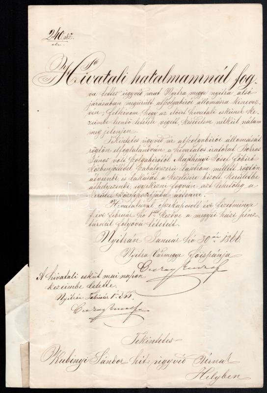Nyitra 1866 Szolgabírói kinevezés Ocskay Rudolf főispán aláírásával