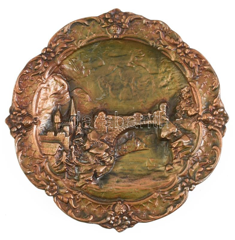 Fali dísztál, közepében tájkép folyóval és várral, fém, jelzés nélkül,...