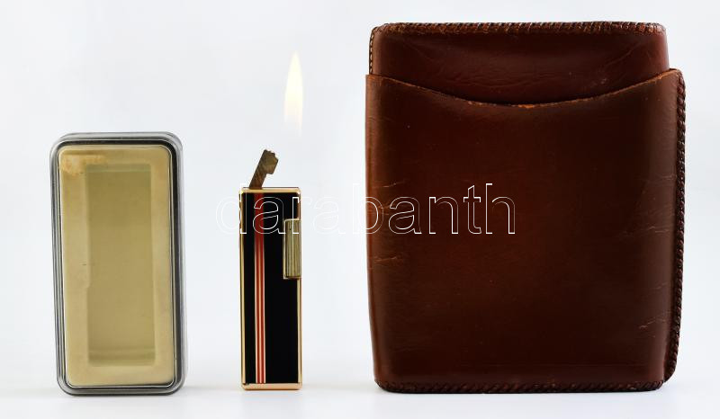Piezzos öngyújtó, feltöltve, szép állapotban, h: 7 cm + Bőr szivartok, kis kopásnyomokkal, 14×11 cm