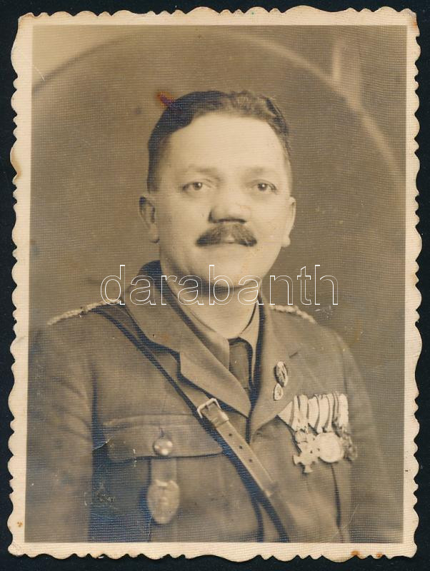 Description: cca 1930 Frontharcos katona portréja, rajta az Országos Frontharcos Szövetség jelvénye, ill. további jelvények, kitüntetések (Koronás Érdemkereszt, Károly-csapatkereszt, stb.); fotó, 8x6 cm