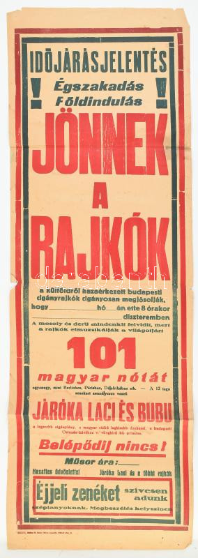 cca 1930 "Jönnek a rajkók...101 magyar nótát ugyanugy, mint Berlinben, Párisban, Délafrikában stb. a 12 tagis zenekart személyesen vezeti Járóka Laci és Bubu a legszebb cigánylány a magyar rádió legkisebb énekesei a budapesti Ostende-kávéházban v. világhírű kis prímása", szakadt, hajtott, foltos, a sarkain kis lyukakkal, 94x31 cm