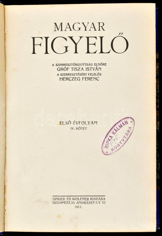 1911 Magyar Figyelő. A szerkesztőbizottság elnöke: Gróf Tisza István, ... https://www.darabanth.com/en/438-Online-auction/438.0/Art-and-other-collectibles/Printed-Materials~1000005/1911-Magyar-Figyelo-A-szerkesztobizottsag-elnoke-Grof-Tisza-Istvan-a-szerk-felelos-Hercze~II2859095