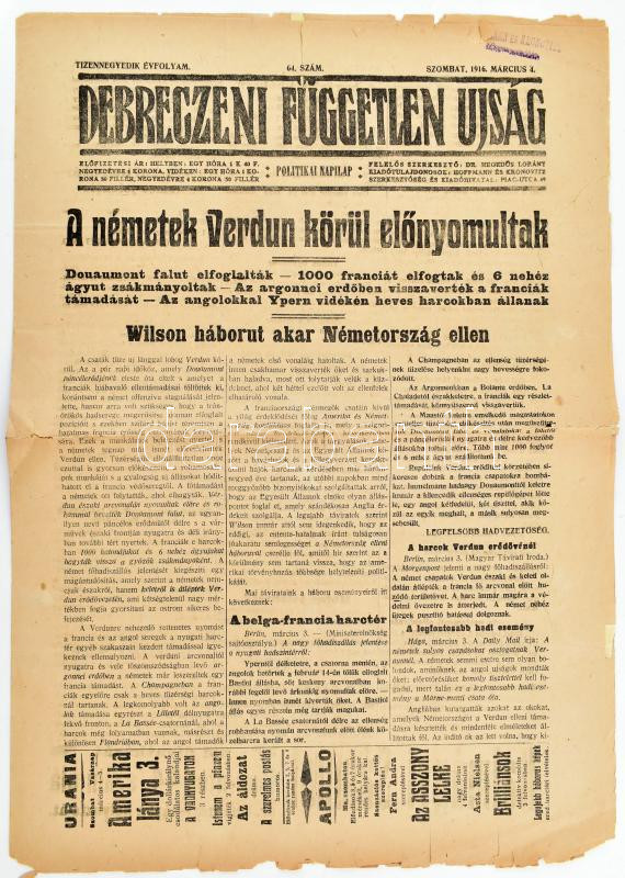 1916 Debreczeni Független Újság XIV. évf. 64. sz., 1916. márc. 4., a c... https://www.darabanth.com/en/438-Online-auction/438.0/Art-and-other-collectibles/Printed-Materials~1000005/1916-Debreczeni-Fuggetlen-Ujsag-XIV-evf-64-sz-1916-marc-4-a-cimlapon-az-I-vilaghab~II2860153